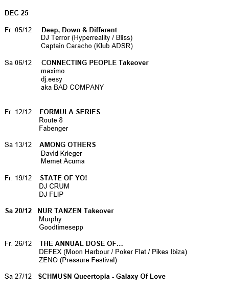 Jeden Freitag und Samstag gestalten lokale und internationale DJs das Musikprogramm. Von HipHop bis Techno präsentiert das Solaris Musikprogrammierung abseits des Mainstreams, ohne sich dabei selbst zu ernst zu nehmen.